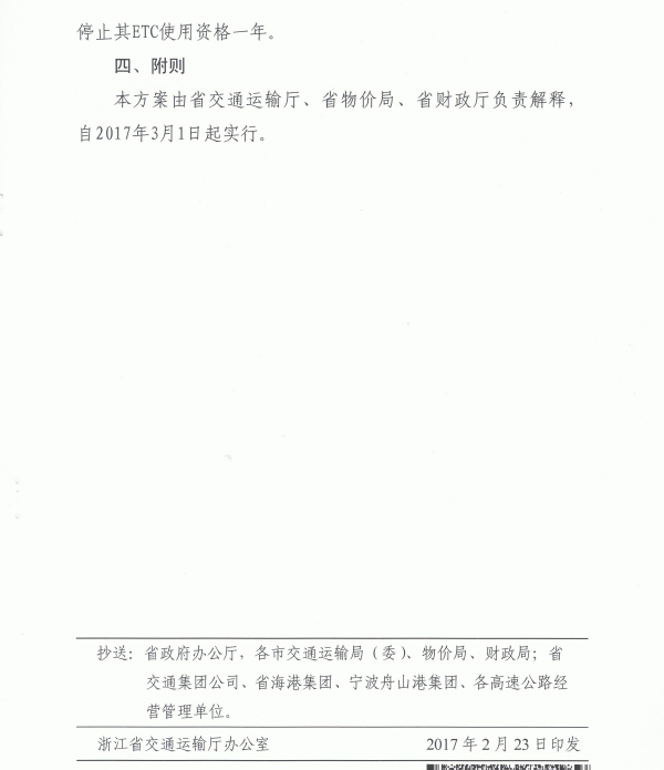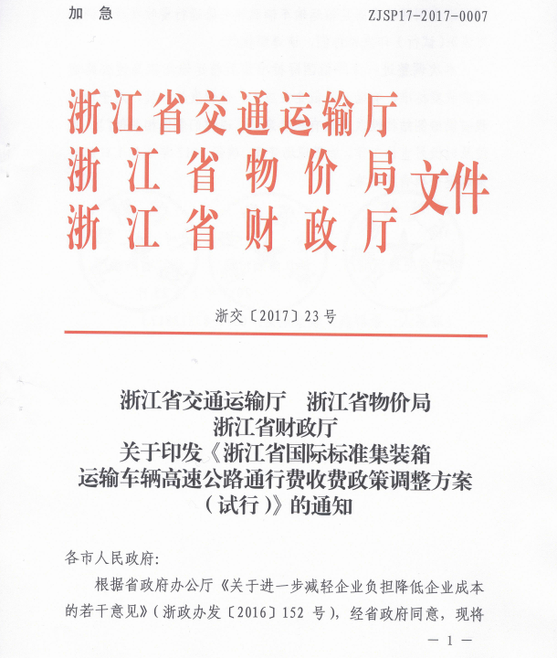 浙江省國際標準集裝箱運輸車輛高速公路通行費收費政策調整方案(試行) 浙交[2017]23號