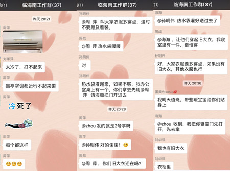 1月26日晚8:21分,臨海南收費(fèi)所微信工作群突然炸開了鍋。所有崗?fù)た照{(diào)因天氣太冷無法有效運(yùn)行,導(dǎo)致亭內(nèi)保暖效果不佳。當(dāng)班班長將此情況反饋到微信工作群后,所里立即采取應(yīng)急措施,組織值班人員將熱水袋、保暖衣物等送往崗?fù)ぁP菹⒃诩业膯T工得知情況后,也紛紛建言獻(xiàn)物,貢獻(xiàn)自己的力量。在惡劣環(huán)境中,大家守望互助,支援一線,共渡難關(guān)。