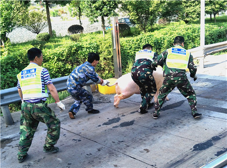 面對突發(fā)的緊急情況,駕駛員一時束手無策,當(dāng)班副班長立即向值班領(lǐng)導(dǎo)匯報(bào),請求增援。為了防止這頭豬給過往車輛造成安全通行威脅,收費(fèi)所工作人員及時關(guān)閉了7號車道,此時的“二師兄”不讓人靠近,大家只好形成一個包圍圈,不讓它竄到其他車道去。幾分鐘后,增援的高速執(zhí)勤隊(duì)員趕到現(xiàn)場,大家七手八腳,終于將這頭豬扛著,送回到了小貨車上。執(zhí)勤隊(duì)員說,這輛車上的一頭豬剛剛還在黃土嶺隧道內(nèi)跳出來一次。