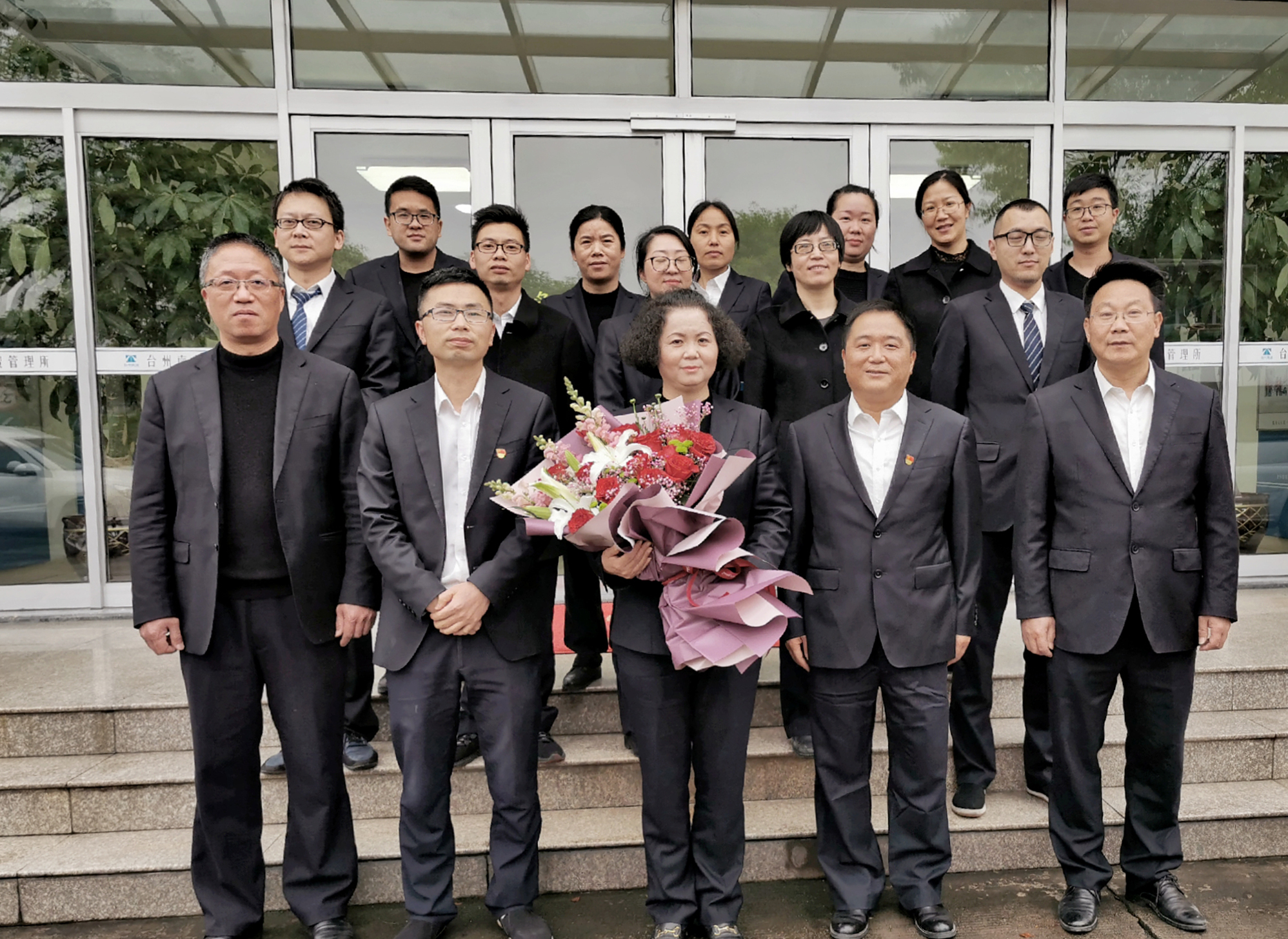 圖為大家合影留念 所長王益民為退休員工頒發光榮退休證書并送上鮮花,大家一起來到收費所大樓前合影留念,將這美好的瞬間記錄下來。 沈芬芳