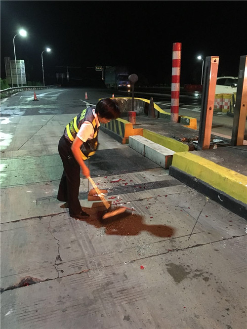 為了保暢通,收費班長讓司機拍照后開到外面等待處理,車輛駛離車道后,發(fā)現(xiàn)稱臺上罩殼跟防護欄被擠彎,地上剩下一堆玻璃碎片殘渣。班長正在處理相關(guān)事宜時,發(fā)現(xiàn)收費員張小芬已經(jīng)麻利的在車道上清理殘余碎片,不多久就恢復(fù)了超寬車道通行。