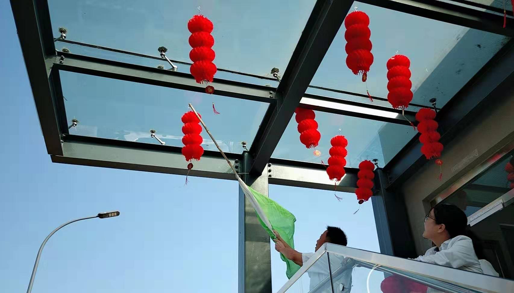 圖為工作人員一起布置收費所 在慶祝祖國70周年生日的日子里,最火的顏色就是紅色。為了弘揚中華民族傳統文化,溫嶺西收費所后勤組早早購置了燈籠、彩旗、五星紅旗,寫好“慶祝祖國70周年華誕”大字等。黨員帶頭,團員緊跟,一線收費員紛紛參與,在收費站大門口、辦公樓、食堂、宿舍等區域精心用五星紅旗、大紅燈籠、五顏六色的彩旗裝點,一抹抹艷麗的國旗紅,成為站點最靚麗的風景。明亮的黃、鮮艷的紅,美麗窗口突然亮了起來,到處洋溢著濃濃的國慶氛圍,為過往司乘提供暢、潔、美的節日行車環境。 溫嶺西收費所后勤組還精心策劃、精細編排,制作了具有特色、獨具創意的生日祝福“小視頻”,祝祖國生日快樂! 通過開展弘揚愛國精神,喜迎國慶活動,溫嶺西收費所全所工作人員更加不忘初心,砥礪前行,共同慶祝祖國70周年華誕。 鄭霞霞