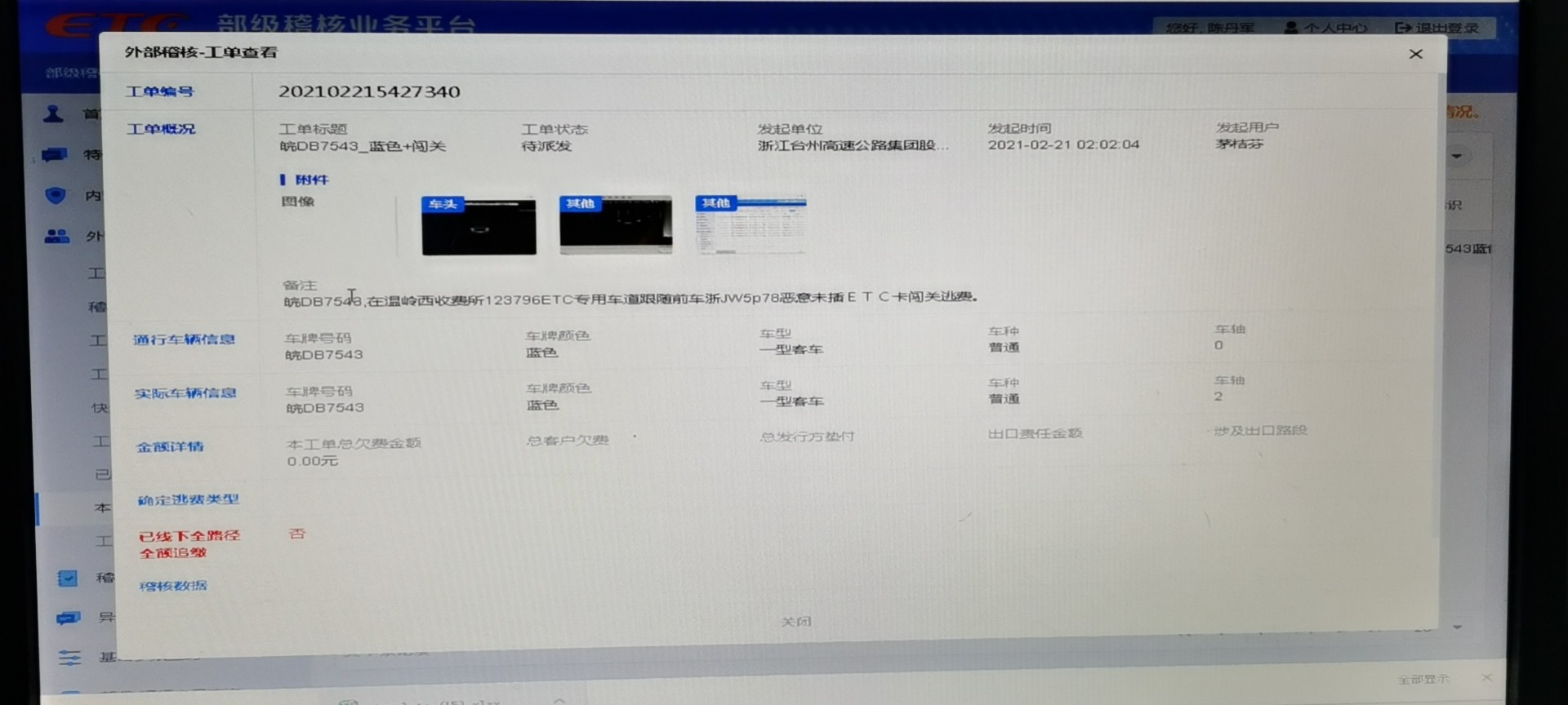 2月20日,溫嶺西收費所發(fā)生一起一輛小型客車在ETC車道緊跟前一輛車出站,借此偷逃通行費,被工作人員發(fā)現(xiàn)后立即上報監(jiān)控,發(fā)起工單,追繳該車通行費。