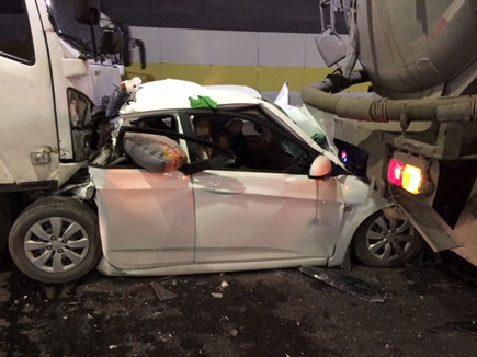 1月15日上午10時(shí)59分,黃土嶺執(zhí)勤隊(duì)剛處理完一起寧向兩車追尾事故,在返回的途中,急促的電話鈴聲再次響起,寧向隧道1200米主車道上又發(fā)生一起油罐車、轎車、集裝箱三車追尾,轎車夾在兩車之間,被撞得“面目全非”,現(xiàn)場(chǎng)隨處散落著汽車零件,可能有人員受傷。