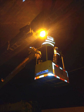 1月31日上午,該所執勤隊員在隧道巡邏時發現溫向快車道一盞照明燈被超高車刮蹭而導致燈罩損壞,燈頭及組件掛落蕩在橋架下,很容易造成二次事故而引起人員傷亡。一發現該隱患,隊長李新波立即向所長李立巍報告險情,馬上聯系高速交警、指揮中心人員,要求立即封道搶修。 大溪嶺隧道所在險情發生的第一時間作出緊急措施,兩名執勤隊員在溫向隧道洞口卡口預警,李立巍向維養中心調來登高車,三名電工隨即進隧道維修脫落的燈罩。經過25分鐘的快速搶修,目前設備已能正常使用,隧道恢復通行。 李新波