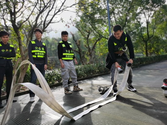 圖為樂清公司員工在水帶操作演練 大溪嶺隧道所執勤隊就是應急救援小分隊,隊員們除了日常工作以外需要進行不斷培訓、演練,只有練就過硬的技能,才能嫻熟地進行救援,確保大溪嶺-湖霧嶺隧道的平安暢通。 陳智慧