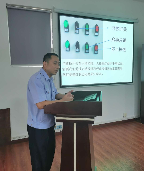圖為電工業務培訓現場 湯寧光在電工崗位已經19載,有著豐富的工作經驗。他用聊家常的方式來講解線路控制的工作原理圖、電路的故障排除方法、光控開關的接線方法,PPT課件中配有隧道所配電房中相應的照片和線路圖,并注解,簡潔明了,通俗易懂。在授課過程中,他每講到一處結尾,便與聽課人員互動,現場為大家答疑解惑,課堂氛圍熱烈,互動感很強。