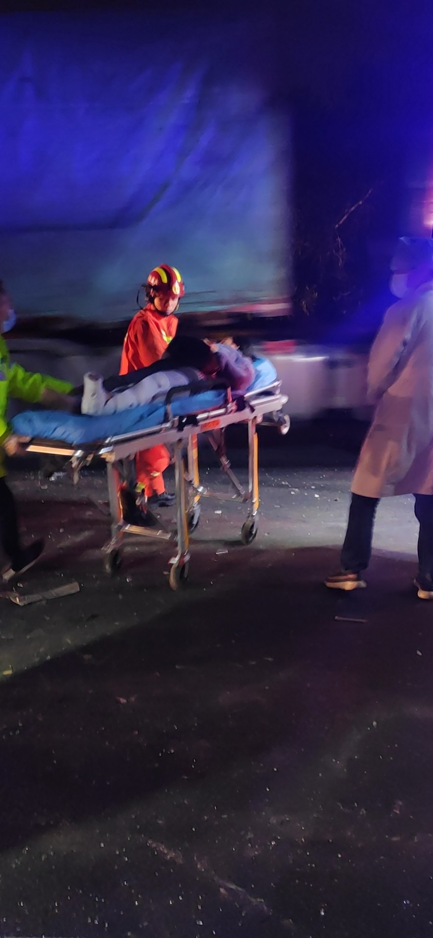 21:50巡邏車和消防車同時到達現(xiàn)場,隊員陳幸飛快的跑下來,以百米沖刺的速度做好巡邏車的安全措施和預(yù)警工作,有3人受傷,事故車頭已嚴重變形,一名女性腰部受傷坐在地上,語速正常,思維清晰。還有二名人員被卡在駕駛室,消防隊員正在查看現(xiàn)場準備施救,受傷人員哭爹喊娘嚎聲不斷,由于救護車還沒達到現(xiàn)場,陳幸在事故車后方硬路肩上維護秩序,防止車輛占道,并同時迎接救護車,湯寧光則在維護現(xiàn)場秩序,阻止其他司機圍觀影響救援。 22:00第一輛救護車到達。醫(yī)護人員準備擔(dān)架,另一名醫(yī)生去詢問坐在地上的受傷人員,由于車頭嚴重變形,司機與鄰座的人都被卡在駕駛室,經(jīng)過消防員的救援,受傷最嚴重的司機首先被救了下來,在被救下的那刻暈了過去,醫(yī)護人員立該把傷員抬上救護車,緊接著消防員救下第二位被卡傷員,第二輛救護車帶著傷員離開,最后一輛救護車卻遲遲沒到,經(jīng)聯(lián)系監(jiān)控中心后得知救護車已上高速,但因后方車輛太多,救護車和拖車都被堵了,經(jīng)和臺州高速交警協(xié)商后,最后清理一個車道讓救護車和拖車先開上來,巡邏車去事故車后方預(yù)警,22:30救護車帶走最后一名傷員,事故車被拖走,路面恢復(fù)正常通車。