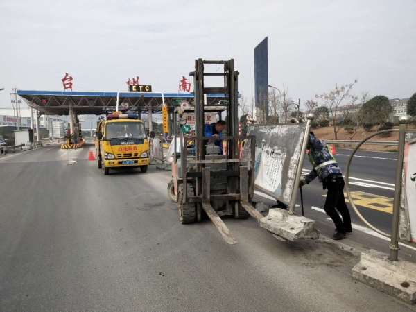 零費(fèi)用清除沉重的廣告式隔離帶 “副站匝道外的廣告式隔離帶能不能幫忙清除下?” 在接到臺州南收費(fèi)所的“求助”電話后,施救中心負(fù)責(zé)人馬上發(fā)動人員,迅速聯(lián)系了外協(xié)單位-----臺州市路橋通遠(yuǎn)車輛施救有限公司,開動鏟車奔赴現(xiàn)場。 據(jù)悉,臺州南副站匝道廣告式隔離帶比較長,而且有損壞,不美觀而影響站所形象,需要全部更換成水馬。但是其底部的水泥墩非常沉重,人力不能搬動,所以該所希望施救中心幫忙清除這些廢舊物。