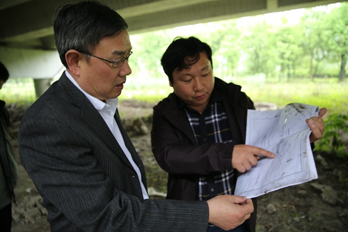 圖為在院橋互通1號橋檢查 細雨中,陳文波一行踏勘走訪了院橋大拉溝104國道跨高速公路主線施工現場、庫灘橋14國道橋洞、院橋互通1號橋等地,了解在實際工作中存在的一些難點問題和存在的安全隱患。