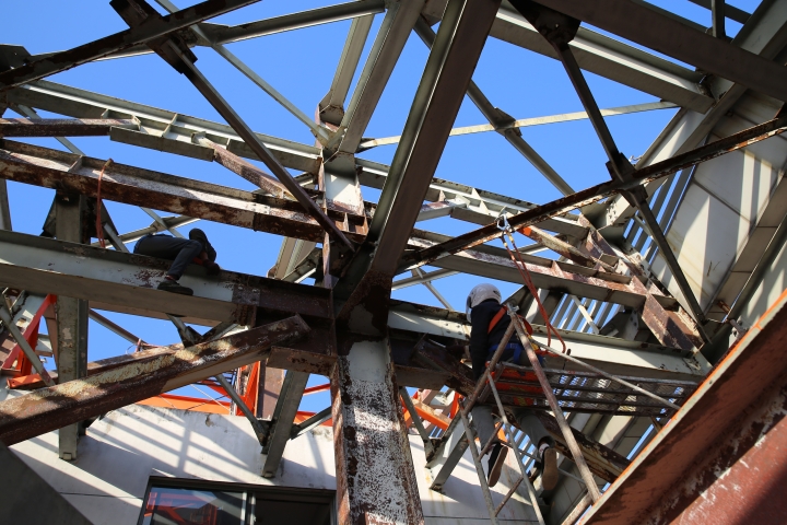 集團安全總監項同富檢查天和大廈除銹施工 11月15日下午,集團安全總監項同富在辦公室、房產公司相關人員的陪同下,到天和大廈樓頂鋼架除銹施工現場檢查施工進展和安全工作。 集團總部天和大廈樓頂鋼架跨度大,高低水平不一致,很難搭建大范圍的防護網及腳手架等施工輔助工具,也無法采用大型機械打磨除銹的方式除去表面的銹層,只能靠手工和電動角磨機除銹。施工人員常常進行高空作業,安全隱患大。
