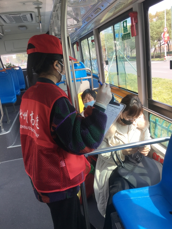 圖為志愿者跟車(chē)防疫服務(wù) “我所在的一班車(chē)來(lái)回一趟是1個(gè)多小時(shí),疫情期出行人員不多,大家上車(chē)前都會(huì)認(rèn)真配合檢查。”毛譯聆說(shuō)道,她一次連續(xù)跟車(chē)要3個(gè)多小時(shí)。 疫情在前,國(guó)企擔(dān)當(dāng),臺(tái)州高速人會(huì)持續(xù)共戰(zhàn)疫情,哪里有需要,挺身在哪里,以行動(dòng)詮釋高速責(zé)任,展現(xiàn)高速風(fēng)采。