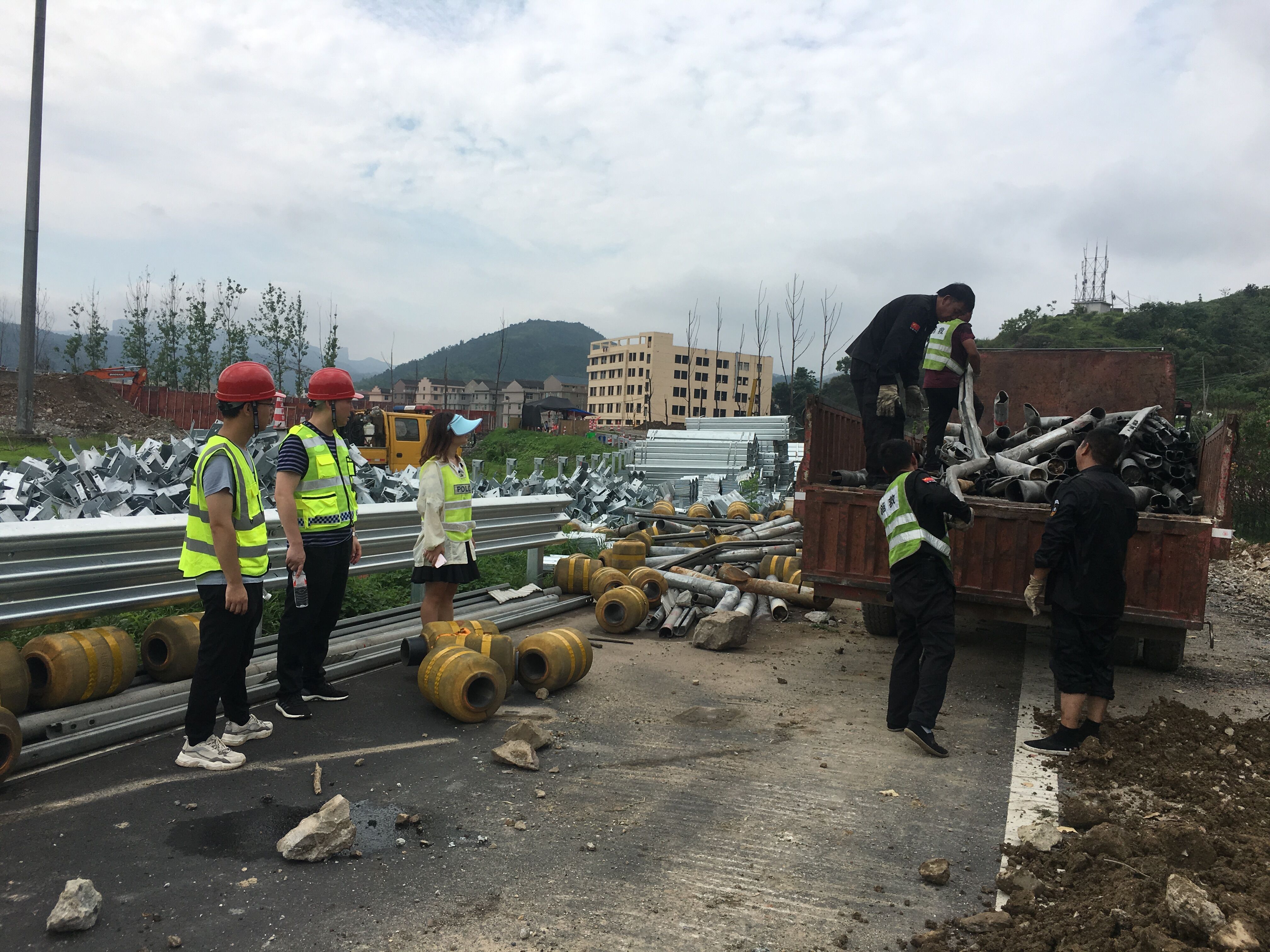 圖為廢舊物資處置現(xiàn)場 一大早,小組成員直接抵達(dá)事故現(xiàn)場,戴上安全帽、穿上反光背心,伴隨著“轟隆隆”的打樁聲,大家穿過臨時為高架橋斷層搭建的鐵梯,從布滿碎石的緩坡爬上施工區(qū)。此時挖掘機、裝載機等不停作業(yè),現(xiàn)場灰塵彌漫,環(huán)境惡劣,大家冒著酷暑一直守在現(xiàn)場監(jiān)督,對廢舊物資進(jìn)行分類,逐一清點,嚴(yán)把廢舊物資處置關(guān)。