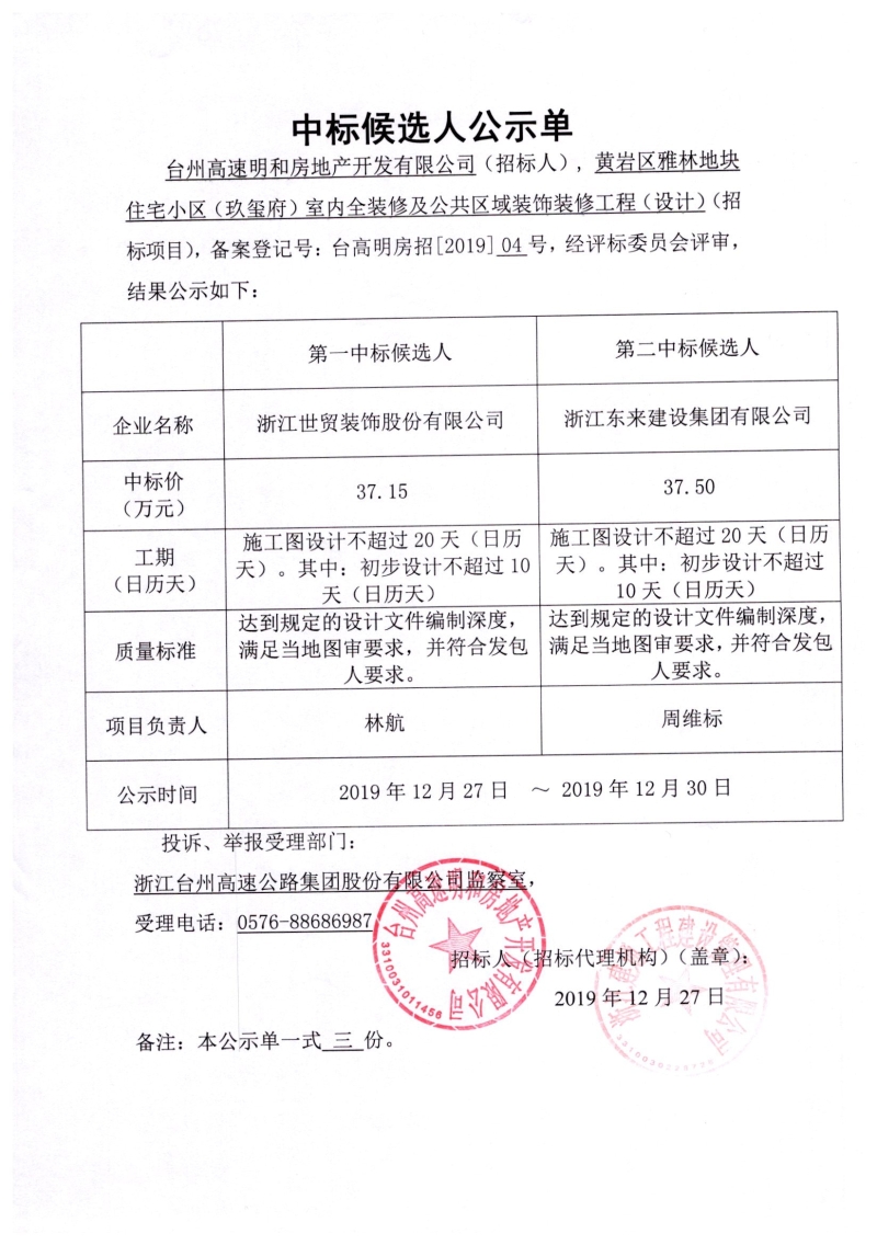 黃巖區(qū)雅林地塊住宅小區(qū)(玖璽府)室內(nèi)全裝修及公共區(qū)域裝飾裝修工程(設(shè)計)中標(biāo)候選人公示單