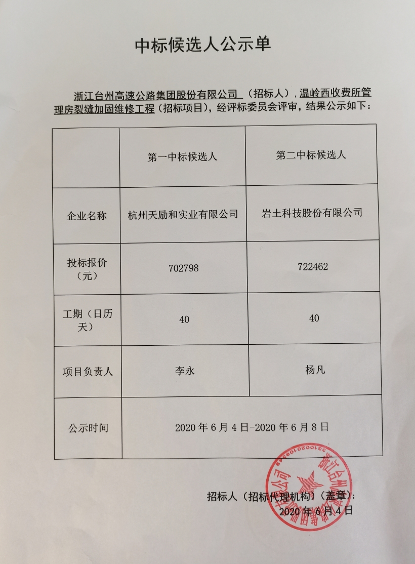 溫嶺西收費所管理房裂縫加固維修工程中標候選人公示單