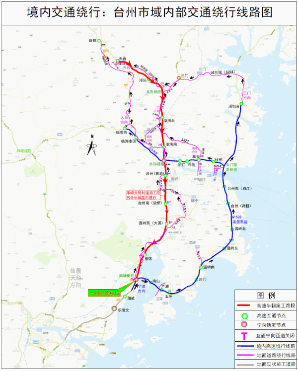 (2)溫州、福建往溫嶺、路橋、椒江、黃巖、三門線路:通過G15甬臺溫高速→南塘樞紐→G1523甬莞高速→→→①溫嶺車輛沿溫嶺南下高速走澤坎線;②路橋車輛沿臺州(路橋)下高速走東方大道;③椒江車輛沿臺州東(椒江)走海虹大道→市府大道;④黃巖車輛沿臺金高速沿江下高速→馬上線→S325復線;⑤三門車輛沿浦壩港下高速→嶺三線(S224);⑥重新回到G15甬臺溫高速建議沿浦壩港下高速→嶺三線(S224)→三門互通上高速。