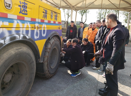 圖為捆綁好的防滑鏈 輪胎捆綁防滑鏈是車輛行駛在冰天雪地中增加輪胎對路面的摩擦力,以防止打滑的一項安全措施。雖然在南方這樣的氣候很少見,在實際工作中也較少遇到,但是施救中心每年都會開展相關的操作演練,并且要求全體員工務必熟練操作,此是安全預防的重要工作之一。