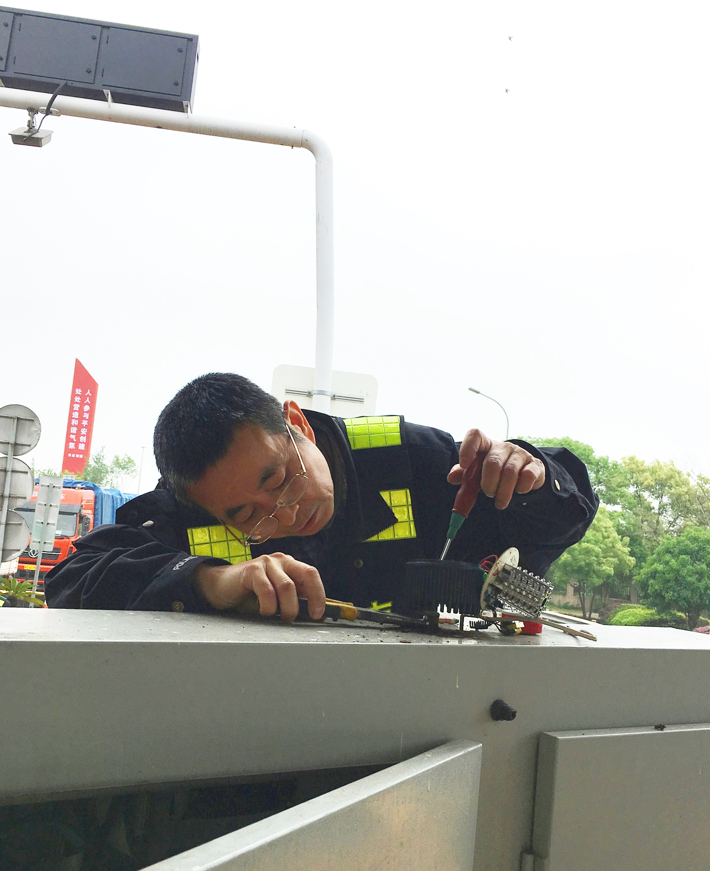 歲月滄桑,時光荏苒,如今張鵬兩鬢已顯斑白,眼睛也有些老花,但依然精神抖擻,干勁十足。8月12日,臺風過后的臺州南收費所內廣場有兩盞路燈同時失效。當登高車過來的時候,盡管當時他因痛風雙腳腫大還沒完全消退,但仍第一個跳上去維修,站在狹小車兜里佝僂著身子,戴著老花鏡更換各種設備。8月的烈日炎炎似火燒,沒過一會豆大的汗珠從他額頭上淌下透濕了全身。