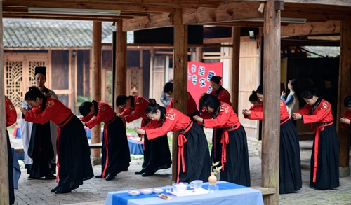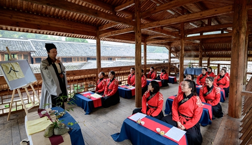 課堂正式開始前進行了一場隆重的“開學儀式”。 據《禮記》記載:“禮義之始,在于正容體,齊顏色,順辭令?!币虼耍谝徽n即是“正衣冠”。同學們換上漢服,一一站立,由先生依次檢查,然后“衣冠整齊”地排著隊集合。之后按照先生的要求,將手放到水盆中“凈手”,寓意凈手靜心,去雜存精,希望能在日后的學習中專心致志、心無旁騖。步入學堂后,舉行拜師禮,同學們向至圣先師孔子三叩首、進獻“釋菜禮”,寓意尊師重道、勤奮好學。