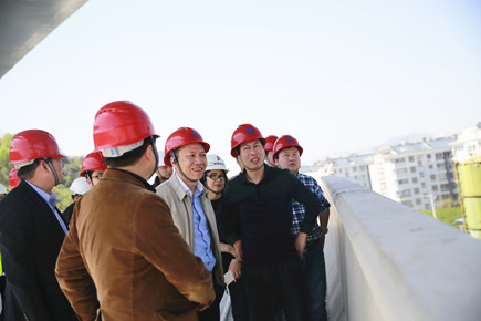 圖為公司總經理張建平在8#立交橋上了解相關工程情況 張建平一行首先實地查看了內環北路(江口段)項目工地,聽取工程進展情況匯報。在現場,只見爆破量達到70%的安然山體已經開辟出一條可供工程車輛通行的大口子,耳邊不停地傳來機器忙碌作業的轟鳴聲。張建平一路由東向西穿行在施工便道上,看到施工區域一側各種安全防范設施有序排列,感受到沿途濃烈的施工氛圍,他對此表示滿意。 途徑內環路8#立交項目工地時,張建平沿著臨時搭設的通道,爬上8#立交橋,遠眺8#立交放射線項目所在地,向有關人員了解該項目前期準備工作情況。眼下,距離11月11日內環路主線通車僅剩下近半年的時間,張建平強調,各部門要努力抓好施工進度,保證工程質量,更要時刻將安全放在首位。 陳林偉