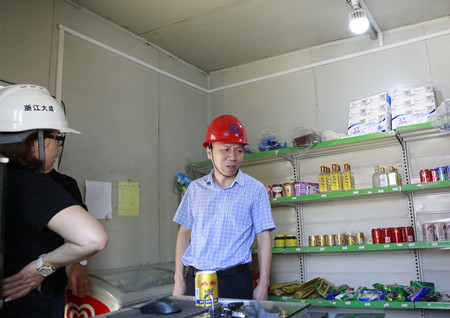 圖為集團(tuán)副董事長(zhǎng)、總經(jīng)理張建平檢查內(nèi)環(huán)路8#立交民工小賣(mài)部